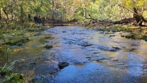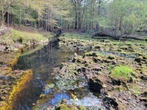 Myrtles Fissure churns out water with the energy of a waterfall or becomes a deep, narrow, stagnant slit of water on the upper banks of the Santa Fe. The fissure is not visible from the river and can the sharp slippery run can be accessed by boat, or through a hike along the riverside through the ACT’s Little Awesome Preserve. The fissure runs parallel to the river, is about 120′ from the river, is around 75′ long, 4′ wide. The shallow run of sharp karst is slippery. During high water, water gushes like a waterfall from the fissure and down the run to the river. One hears it before seeing it. When the river is low, water stagnates in the crack and the run is coated with algae.